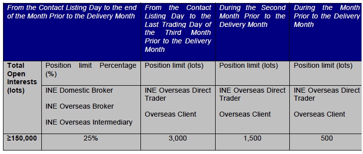 Similar to the futures contracts traded on other domestic futures exchanges, INE imposes a position holding limit on traders and brokers on INE. Details of the position limit rules are set out below: